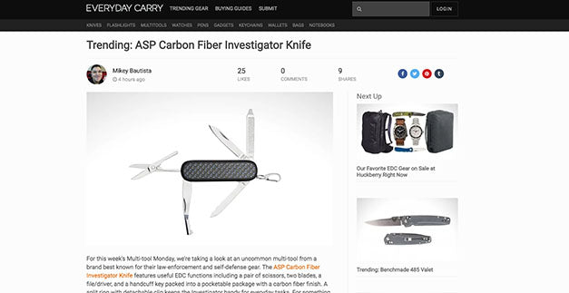 "For this week's Multi-tool Monday, we're taking a look at an uncommon multi-tool from a brand best known for their law-enforcement and self-defense gear. The ASP Carbon Fiber Investigator Knife features useful EDC functions including a pair of scissors, two blades, a file/driver, and a handcuff key packed into a pocketable package with a carbon fiber finish"