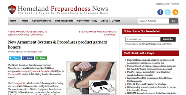 "The North American Association of Uniform Manufacturers and Distributors (NAUMD) has recognized Armament Systems & Procedures (ASP) for its Transport Kit via the Public Safety Product Innovation Award."