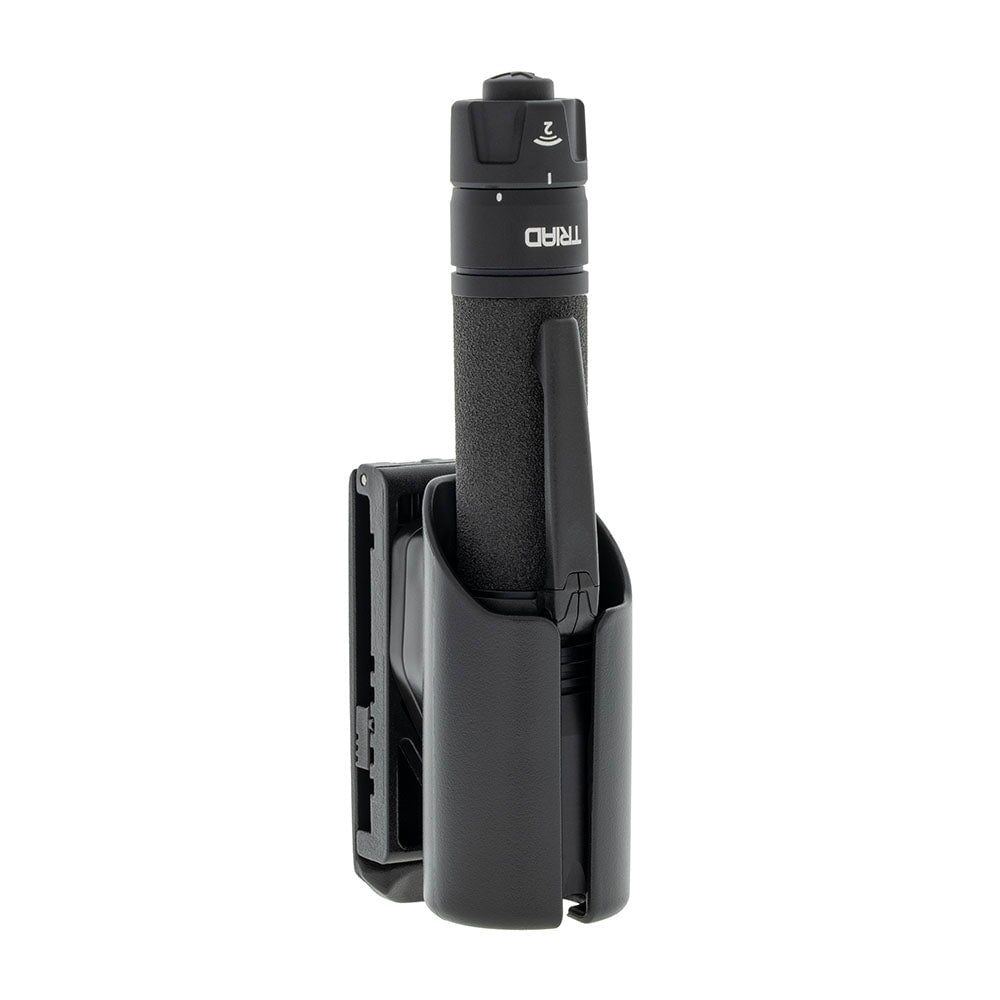 The Triad is machined from 6061 T6 aerospace aluminum and type III hardcoat anodized in a proprietary matte black finish. The barrel is wrapped in our exclusive, all-weather foamed vinyl grip. Premium components include Cree XPG LED, gold-plated connectors, polished aluminum reflector and optical glass lens. In keeping with our emphasis on intuitive design and simplicity in our law enforcement tools and training, activation of the Triad is via a single pressure switch. A 3-position twist selector allows choice of intermittent, constant-on, or locked.