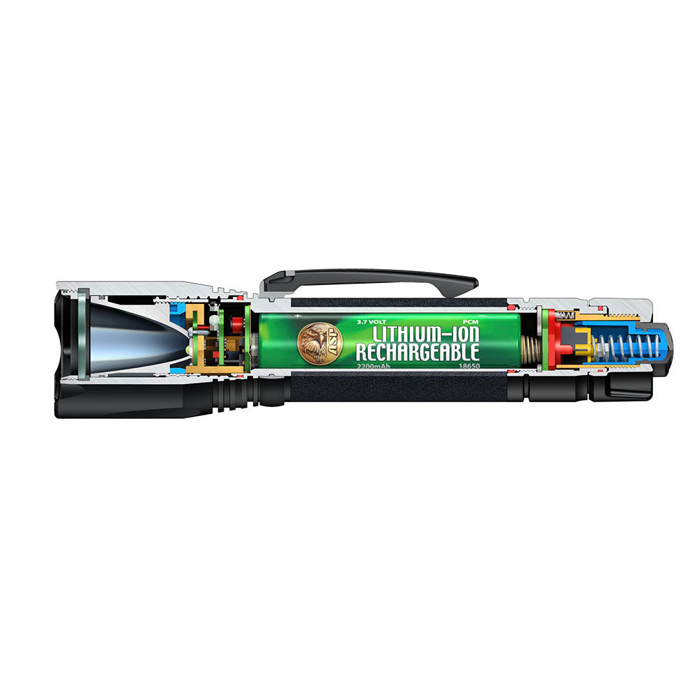 Includes a high-performance ASP 18650 rechargeable battery, battery storage case, retractable charging cord and adjustable/removable pocket clip.