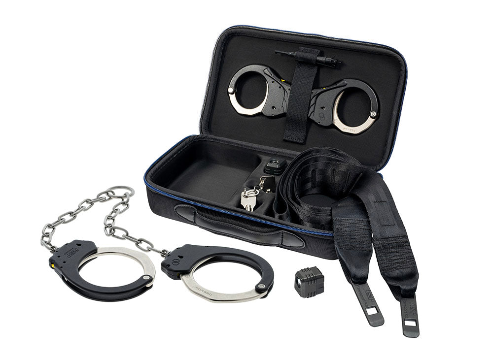 This complete kit includes our revolutionary Rigid Plus Cuff wrist restraints, an extended handcuff key, a set of Ankle Plus Cuffs, extra-long belt, two auto-engaging restraint system locks, two cylinder keys, and a custom-designed EVA-molded carrying case.