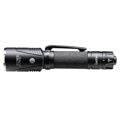 Like all ASP tactical flashlights, the Spectrum is built to the most demanding law enforcement duty standards. It’s machined from 6061 T6 aerospace aluminum and type III hardcoat anodized in a proprietary matte black finish. The barrel is wrapped in our exclusive, all-weather foamed vinyl grip. Premium components include Cree XPG LED, gold-plated connectors, polished aluminum reflector and optical glass lens. In keeping with our emphasis on intuitive design and simplicity in our law enforcement tools and training, activation of the Spectrum is via a single pressure switch. A 3-position twist selector allows choice of momentary, constant-on, or locked.